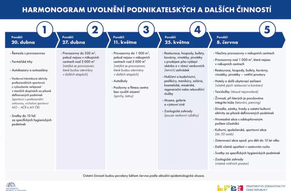 [Update: 25.04.2020] Rząd Czech zdecydował się na dużo szybsze odmrażanie gospodarki niż pierwotnie planował. Np. siłownie i kluby fitness zostaną otwarte już 27 kwietnia a nie 11 maja, a wprowadzenie ostatniego etapu przesunięto na 25 maja z 8 czerwca. To przyspieszenie było możliwe z uwagi na silny spadek liczby zachorowań w Czechach w ostatnich dniach.