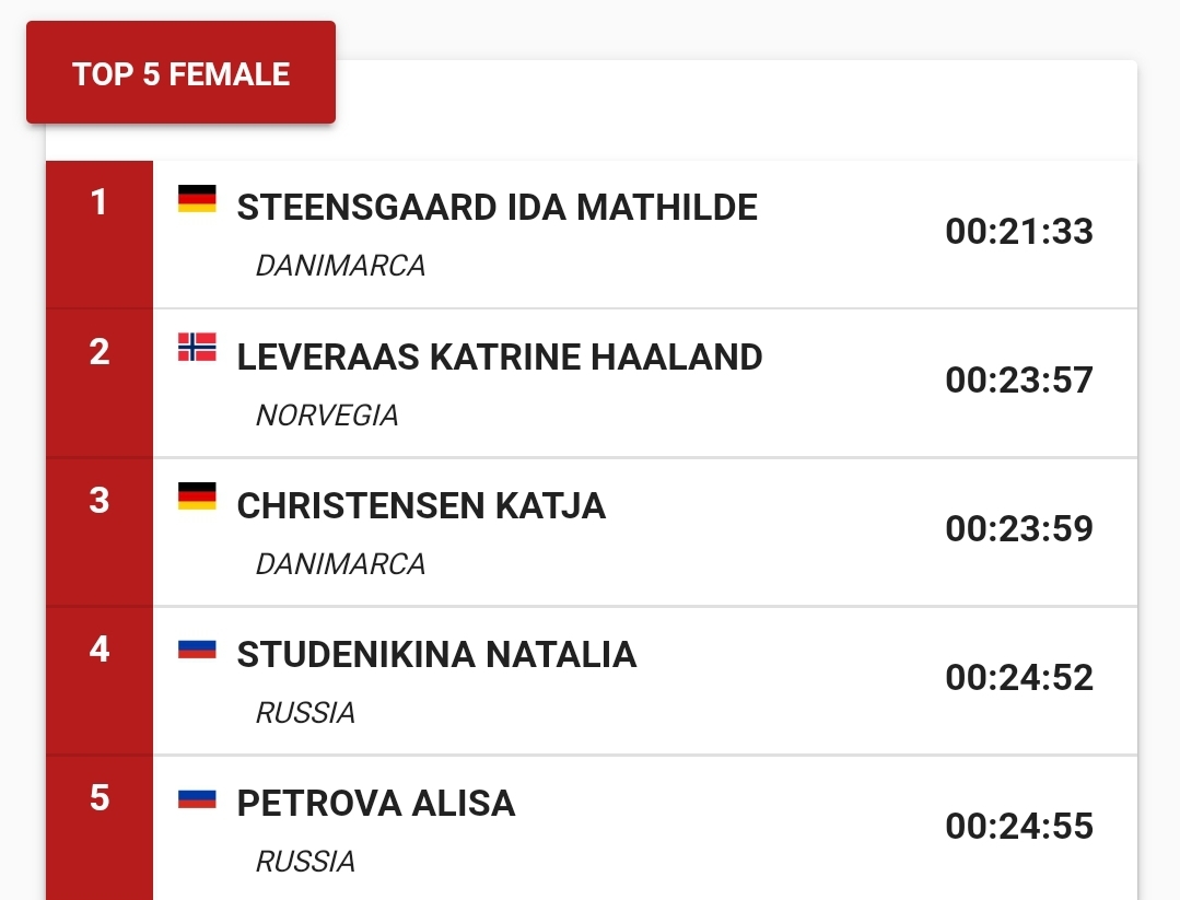 Niespodzianki nie było również wśród pań. Mistrzynią Europy została jedna z faworytek: Ida Mathilde Steensgaard z Danii. Przebiegnięcie 3 km i pokonanie 20 przeszkód (w tym pływania) zajęło jej 21 min. i 33 sek. Jako druga linię mety przekroczyła Katrine Haaland Leveraas z Norwegii (czas: 23 min i 57 sek.), a trzecia była Katja Christensen z Danii, która wpadła na metę zaledwie 2 sek. za Norweżką.