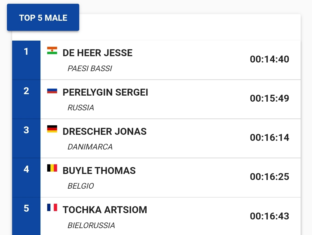 Niespodzianki nie było. Jako pierwszy wśród mężczyzn metę przekroczył Jesse De Heer z Holandii z czasem 14 min. i 40 sek. Holender był wymieniany w gronie faworytów tej imprezy. Wicemistrzem Europy został Sergei Perelygin z Rosji, który stracił do zwycięzcy ponad 1 minutę. Perelygin, podobnie jak inni zawodnicy z Rosji i zawodnicy z Białorusi, nie mogli startować pod flagą swojego kraju. Brązowy medal zdobył Jonas Drescher. Jego czas to 16 min. i 14 sek.