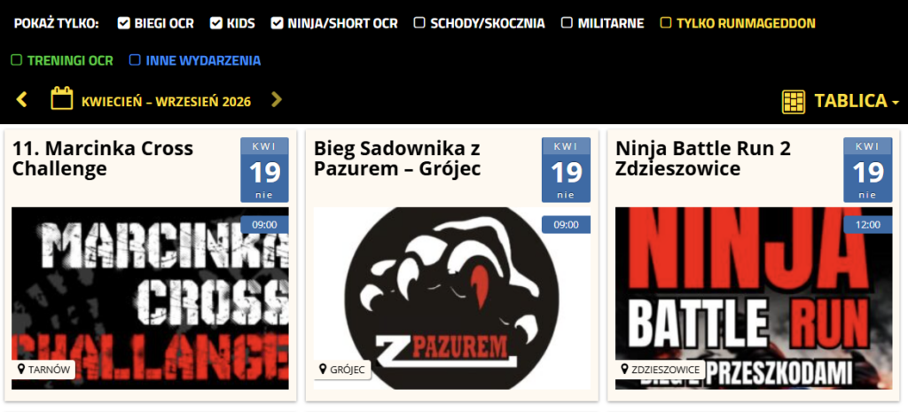 W najbliższy weekend w Polsce odbędą się dwa biegi przeszkodowe i jedno wydarzenie przeszkodowe. W każdym z trzech przypadków w kalendarzu należy zarezerwować sobie niedzielę 19 kwietnia. Oby tylko pogoda dopisała.